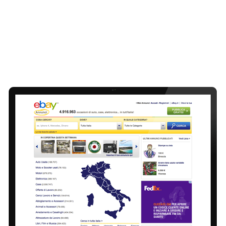 eBay Annunci è il sito di annunci locali del gruppo eBay grazie al quale si può comprare o vendere facilmente in ogni città o regione. Con eBay Annunci acquirente e venditore si incontrano di persona per concludere l'affare.